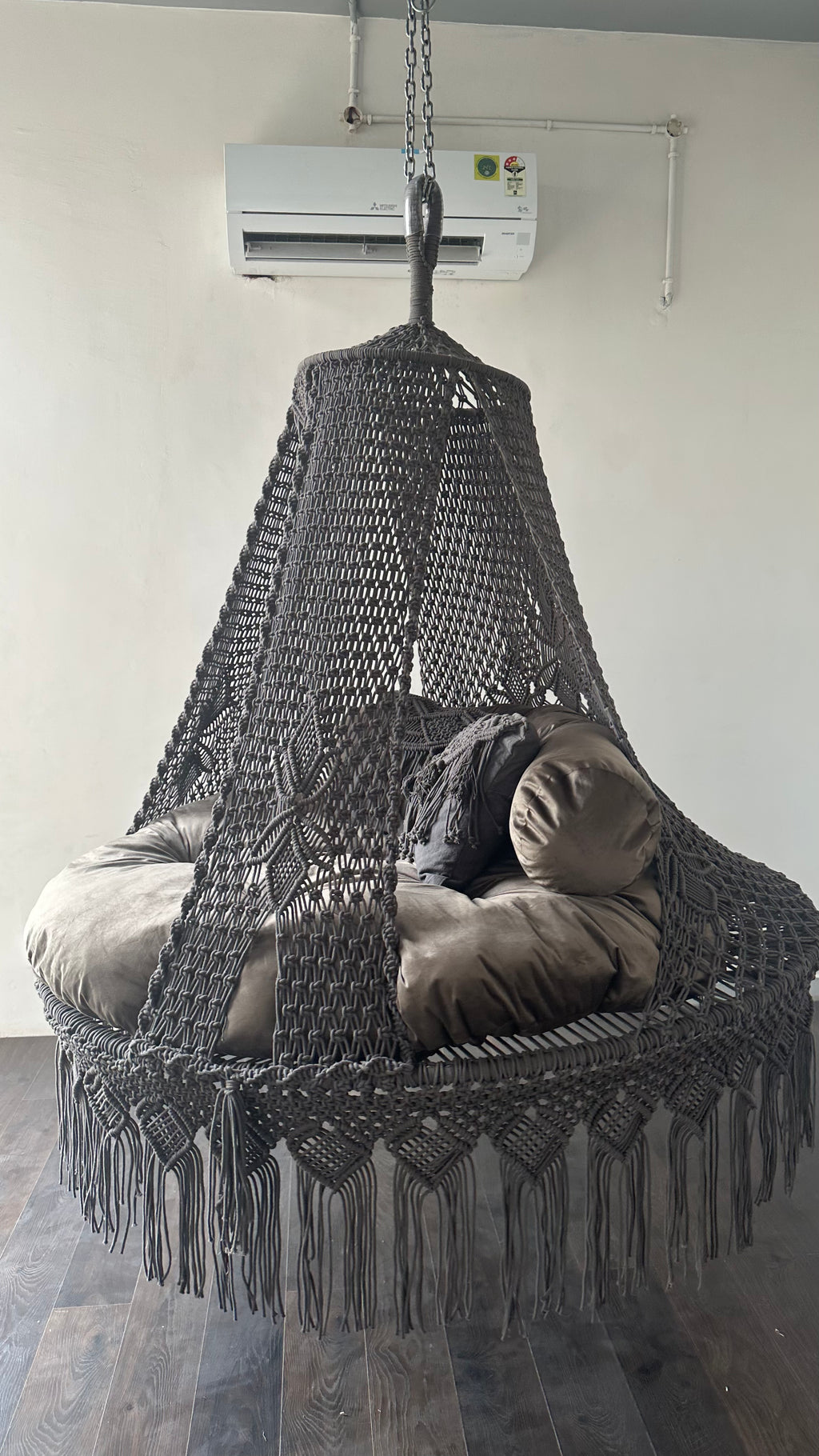 Introducing the Ash grey bed swing for adults and kids, the ideal mix of comfort and style for your outdoor escape. Carefully handcrafted, this swing chair features a stunning macrame design that enhances the charm of any terrace or outdoor area.