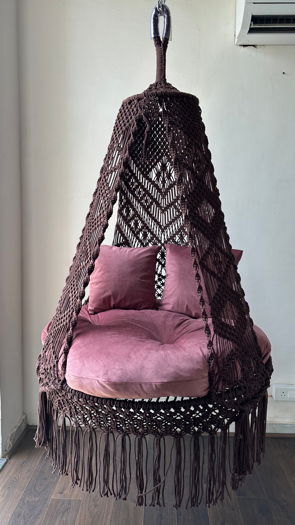 Add a vibrant touch to your living room with this beautifully handcrafted Berry Bloom Macrame swing, with a soft, radish pink mattress for maximum comfort. Designed for solo relaxation and its intricate boho-style macrame pattern creates a cozy, comfortable and artistic vibe. Ideal for balconies, patios, bedrooms, this compact swing is both space-saving and durable, perfect for indoor and outdoor lounging with a bold, stylish charm.