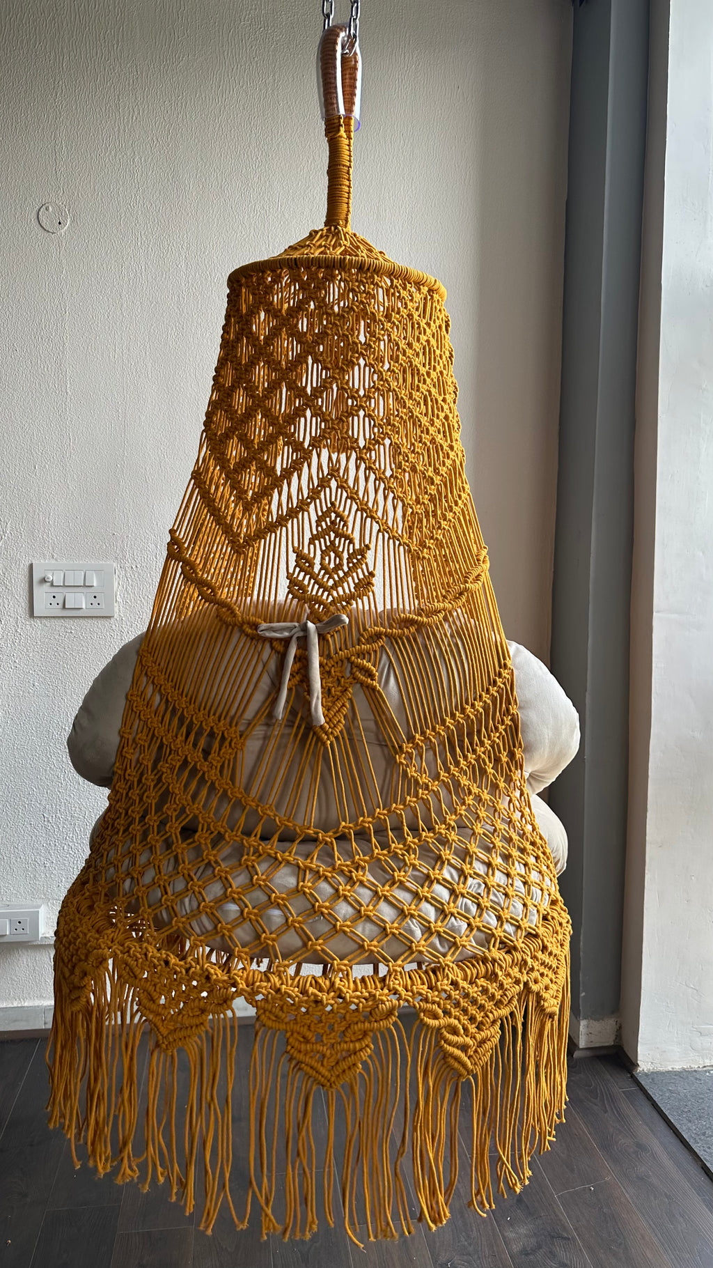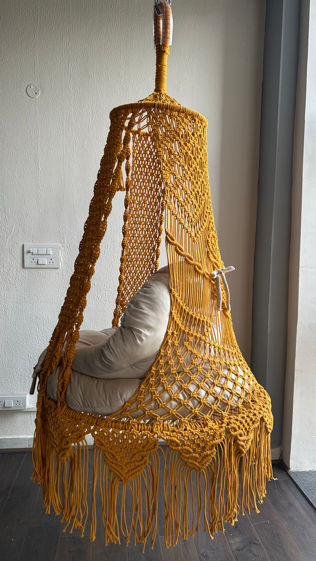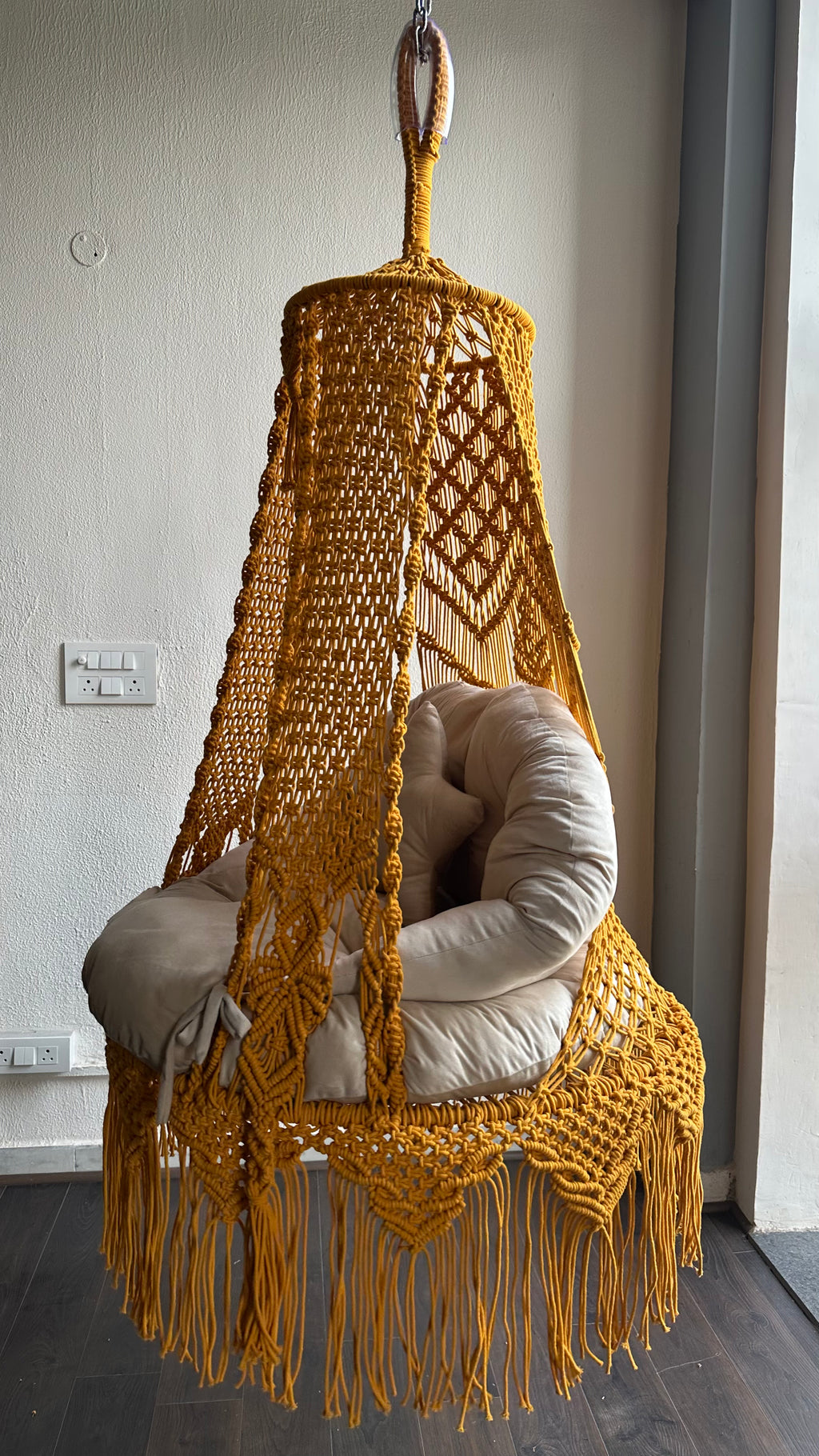 Introducing the Sunshine swing with cream backrest perfect for adults and kids. Elevate your space with this exquisite handcrafted couple macrame swing a perfect blend of bohemian elegance and cozy comfort. Designed with intricate macrame knots, delicate fringe details, and a sturdy wooden frame, this hanging swing adds charm to any indoor or outdoor setting.